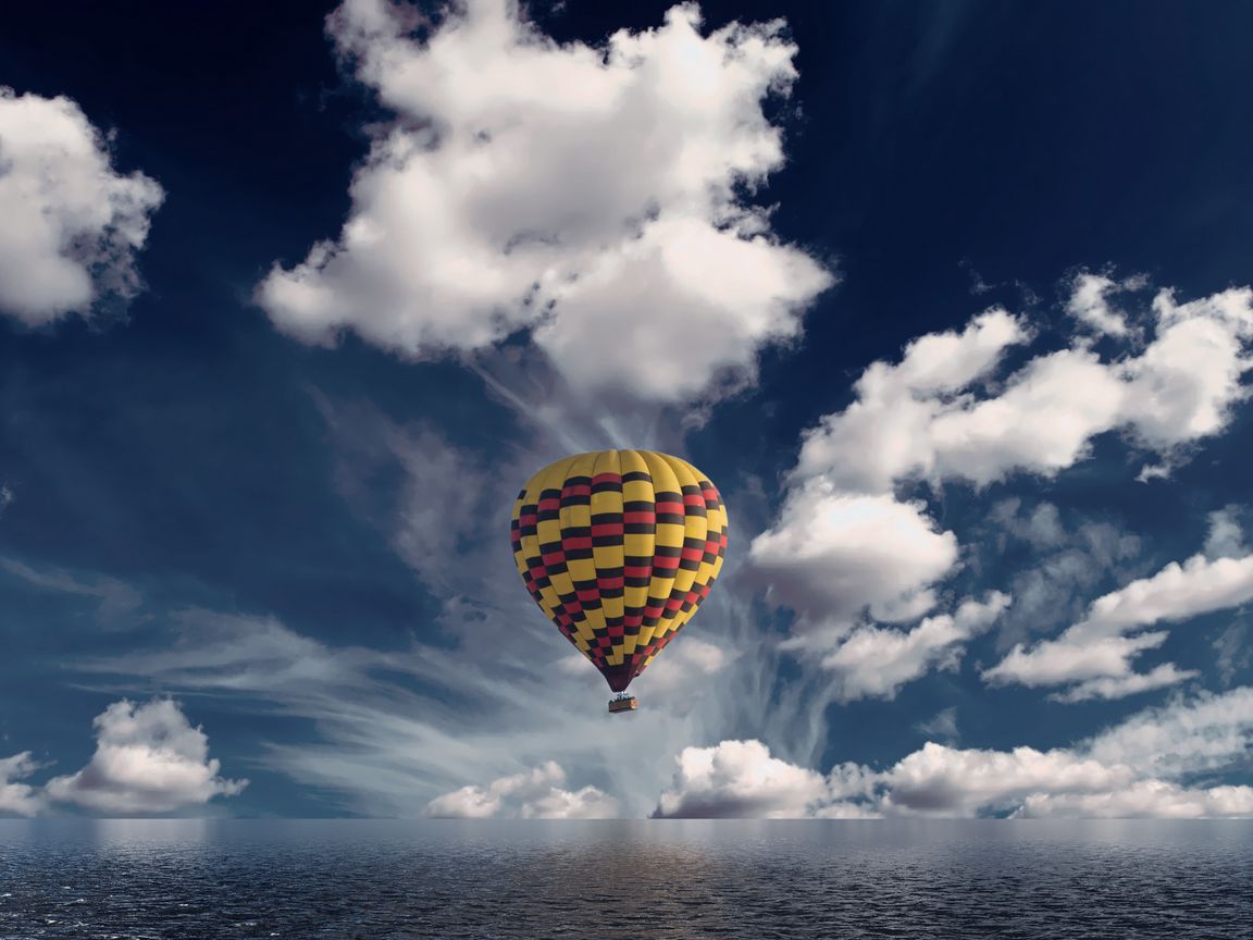 Download 1152x864 air balloon, aerostat, sea, horizon, clouds wallpaper, background standard 4:3