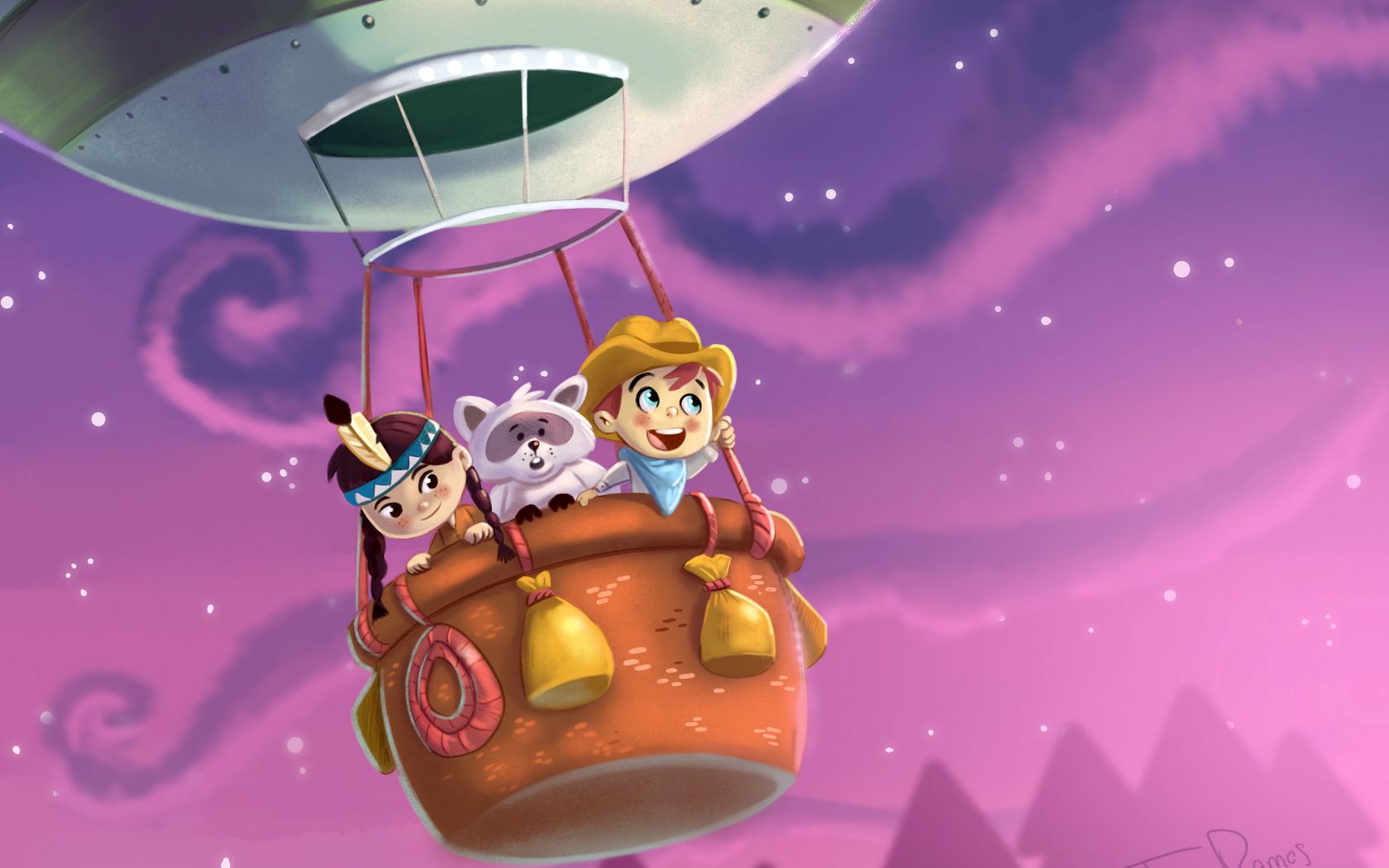 Download 1680x1050 air balloon, children, raccoon, art, flight, travel wallpaper, background widescreen 16:10