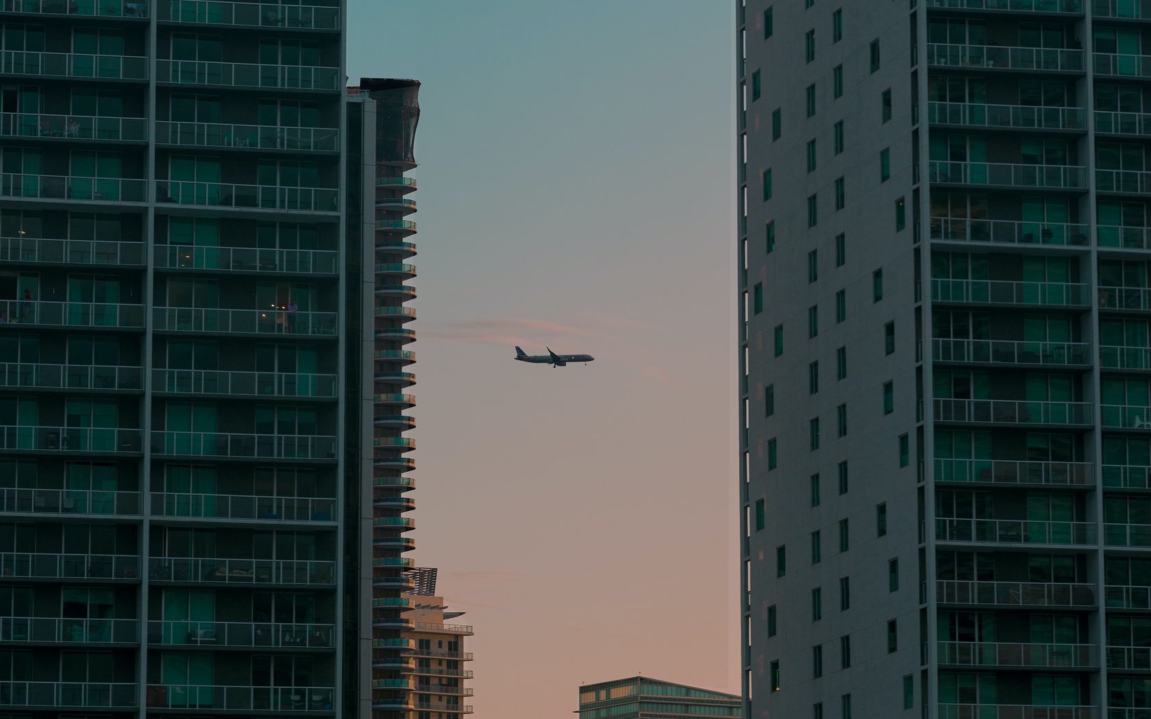 Download 1680x1050 airplane, buildings, skyscrapers, evening wallpaper, background widescreen 16:10