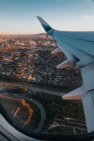 Download 320x480 airplane, wing, city, aerial view, overview wallpaper, background samsung galaxy ace gt-s5830, sony xperia e, miro, htc wildfire s, c, lg optimus
