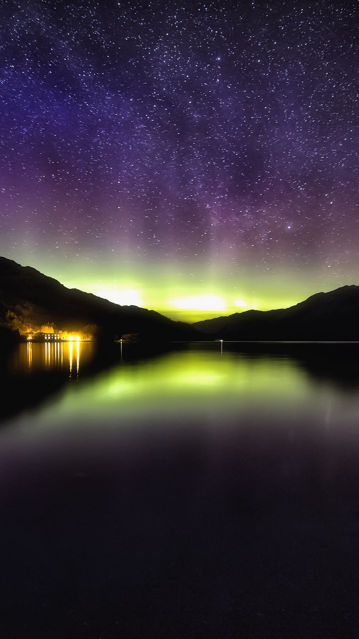 Download 720x1280 aurora, starry sky, night, loch lomond, scotland wallpaper, background samsung galaxy mini s3, s5, neo, alpha, sony xperia compact z1, z2, z3, asus zenfone