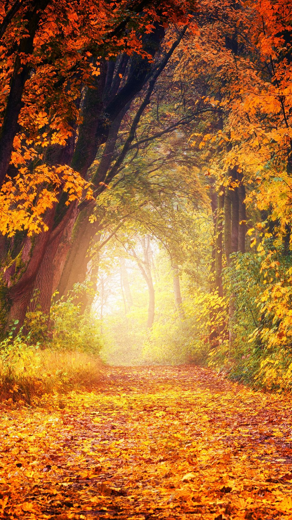 Download 938x1668 autumn, park, foliage, trees, path, light, golden wallpaper, background iphone 8/7/6s/6 for parallax