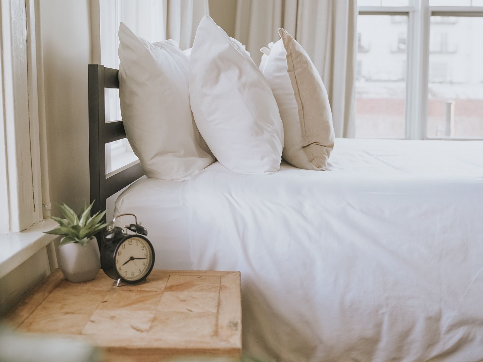 Download 1600x1200 bed, pillows, alarm clock, comfort wallpaper, background standard 4:3