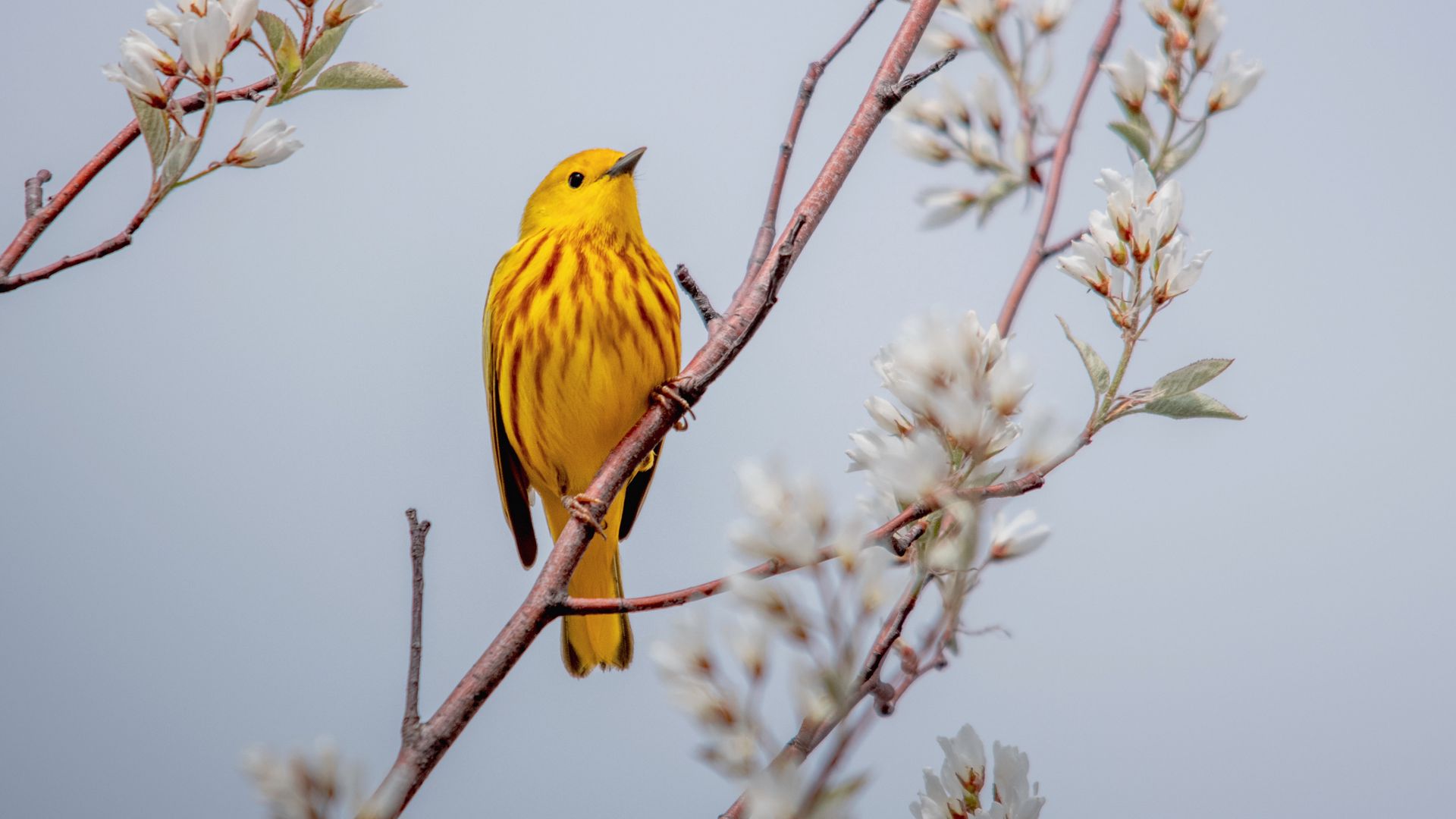 Download 1920x1080 bird, yellow, branch, flowers wallpaper, background full hd, hdtv, fhd, 1080p