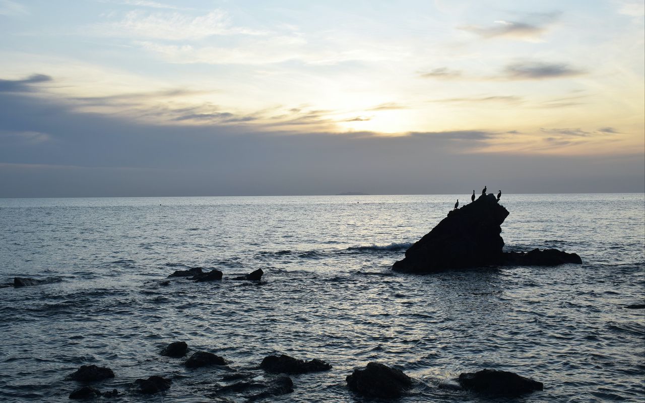 Download 1280x800 birds, rocks, sea, horizon, sky wallpaper, background widescreen 16:10