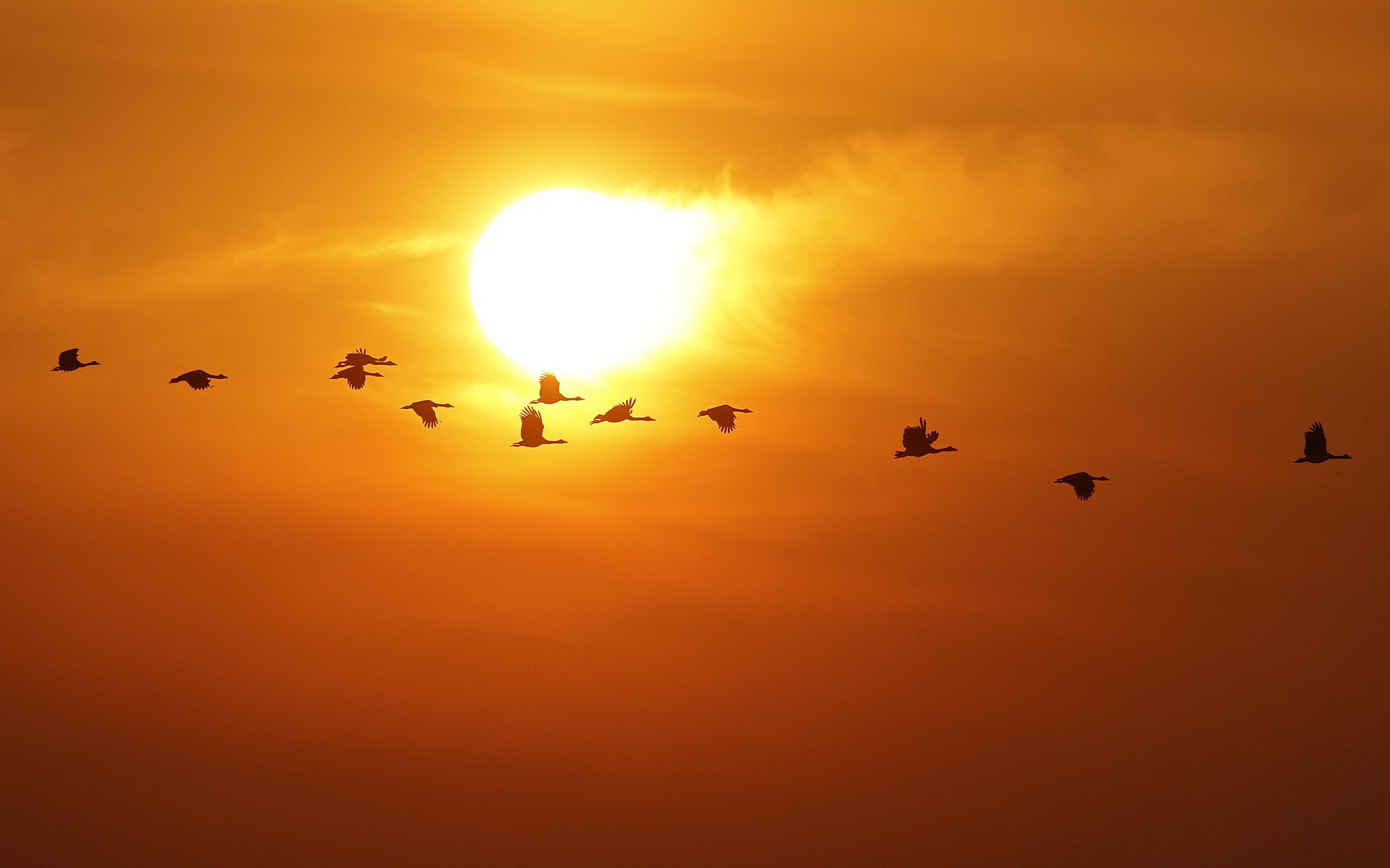 Download 2560x1600 birds, silhouettes, flight, sun wallpaper, background widescreen 16:10