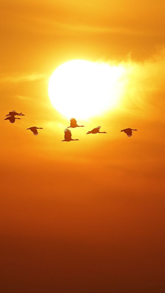 Download 540x960 birds, silhouettes, flight, sun wallpaper, background samsung galaxy s4 mini, microsoft lumia 535, philips xenium, lg l90, htc sensation