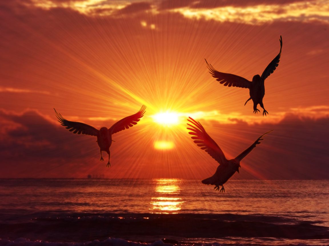 Download 1152x864 birds, silhouettes, sunrise, sea wallpaper, background standard 4:3