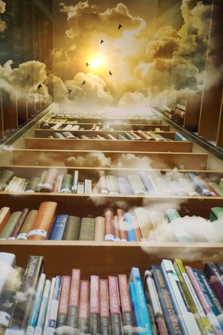 Download 320x480 books, library, photoshop, shelves, clouds, reading, flight wallpaper, background samsung galaxy ace gt-s5830, sony xperia e, miro, htc wildfire s, c, lg optimus