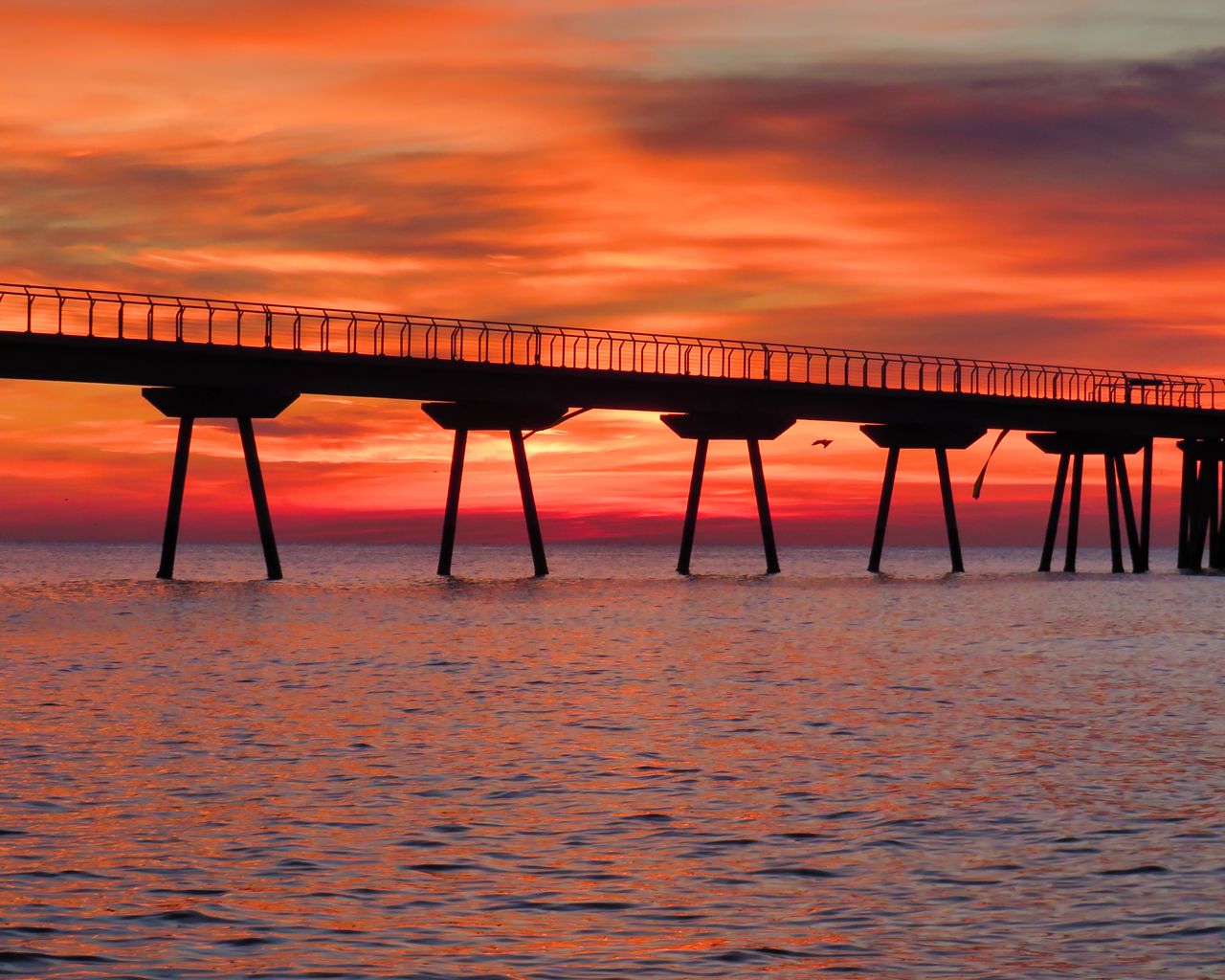 Download 1280x1024 bridge, pilings, sea, sunset, nature wallpaper, background standard 5:4