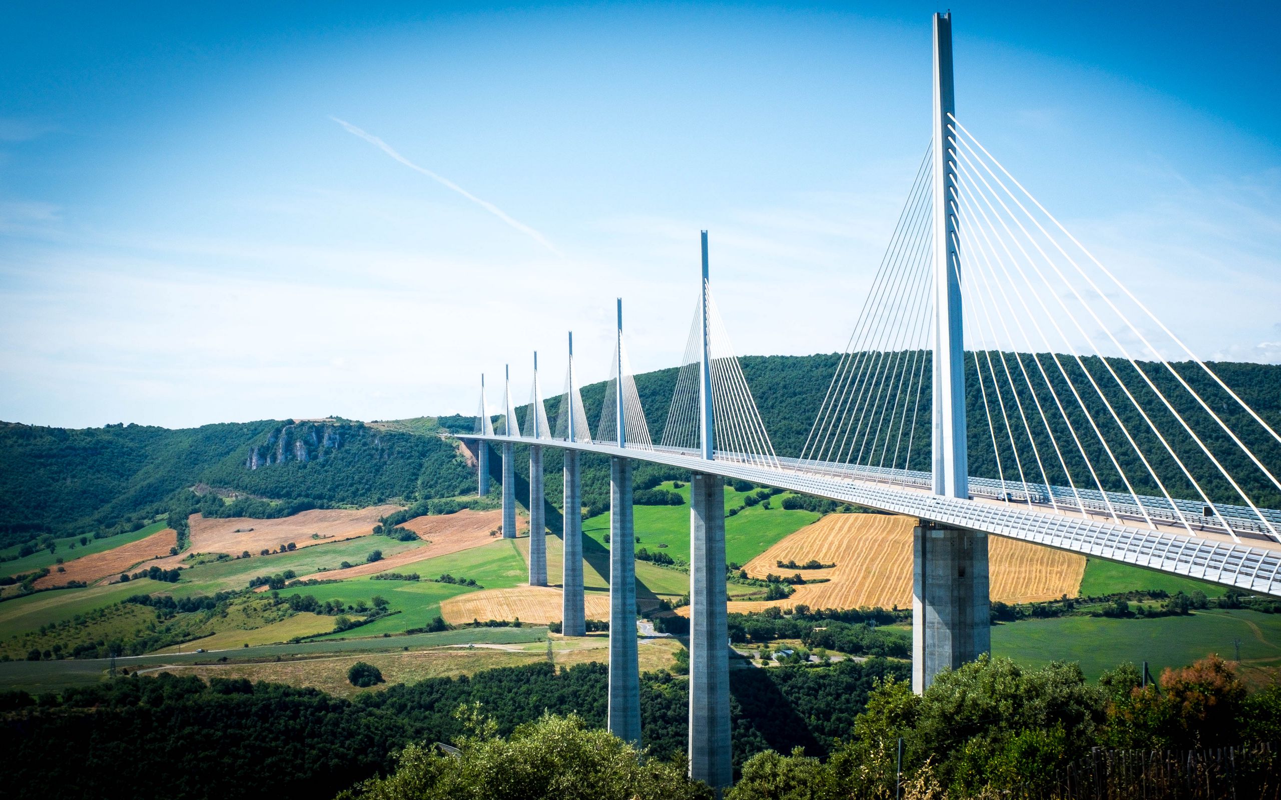 Download 2560x1600 bridge, trees, fields, hills, landscape wallpaper, background widescreen 16:10