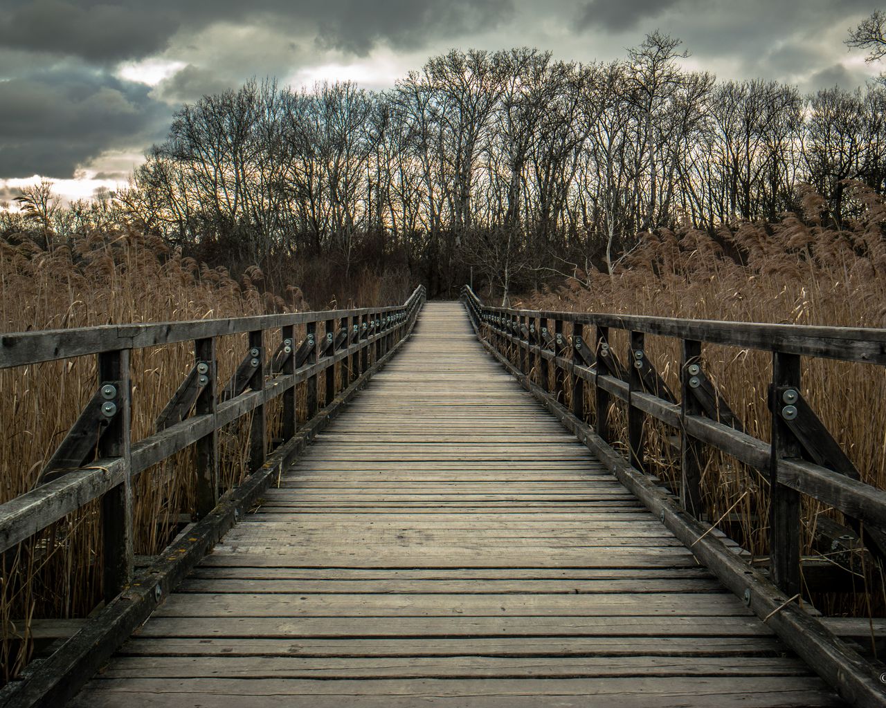 Download 1280x1024 bridge, wooden, nature, trees, reed wallpaper, background standard 5:4