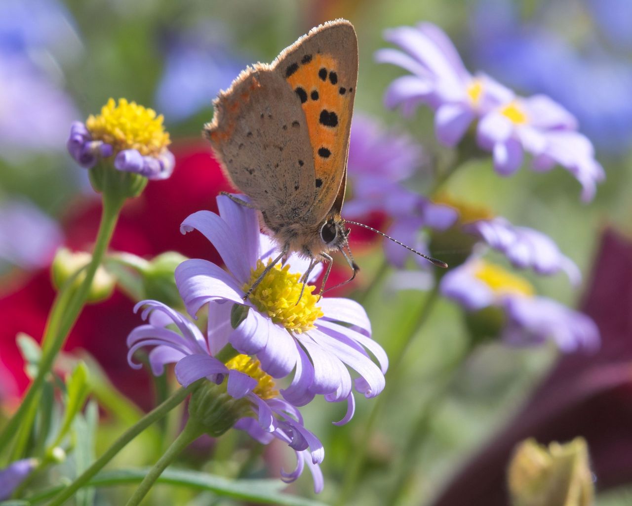 Download 1280x1024 butterfly, wings, flowers, petals, macro, bluer wallpaper, background standard 5:4