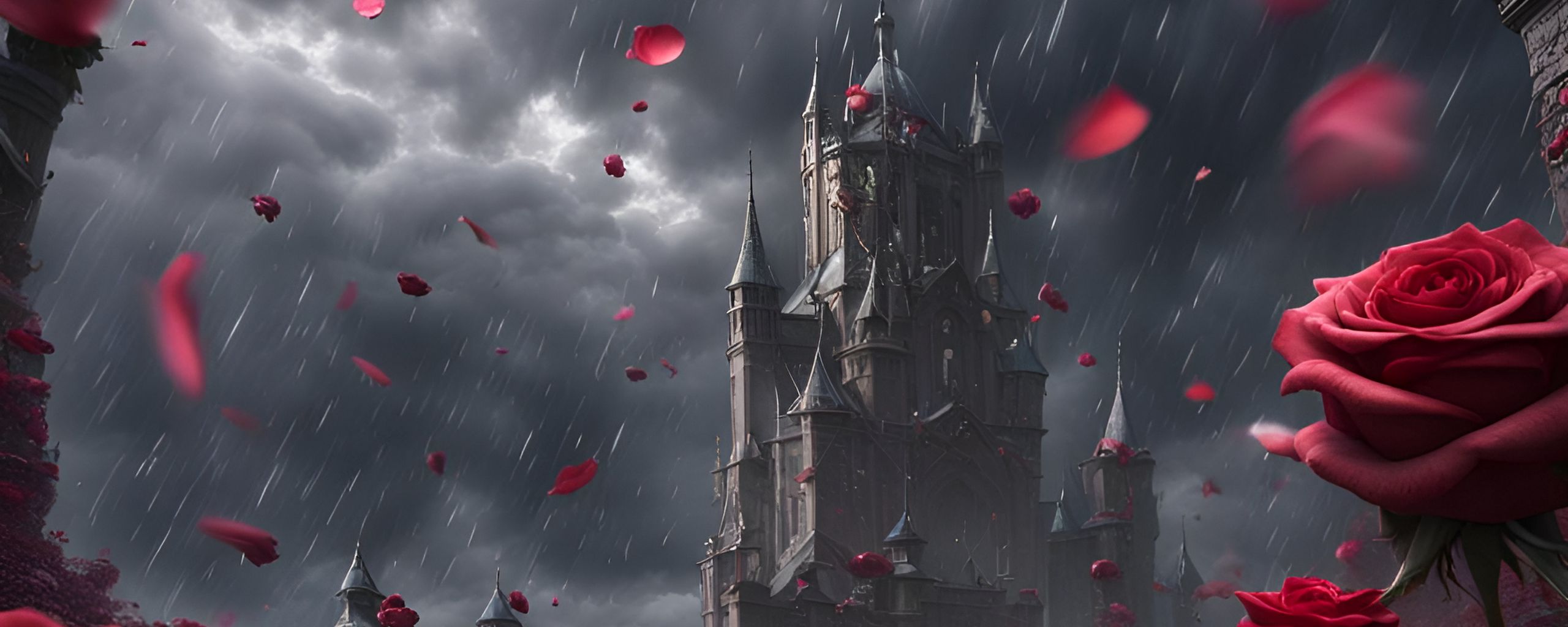 Download 2560x1024 castle, rain, roses, petals, art wallpaper, background ultrawide monitor