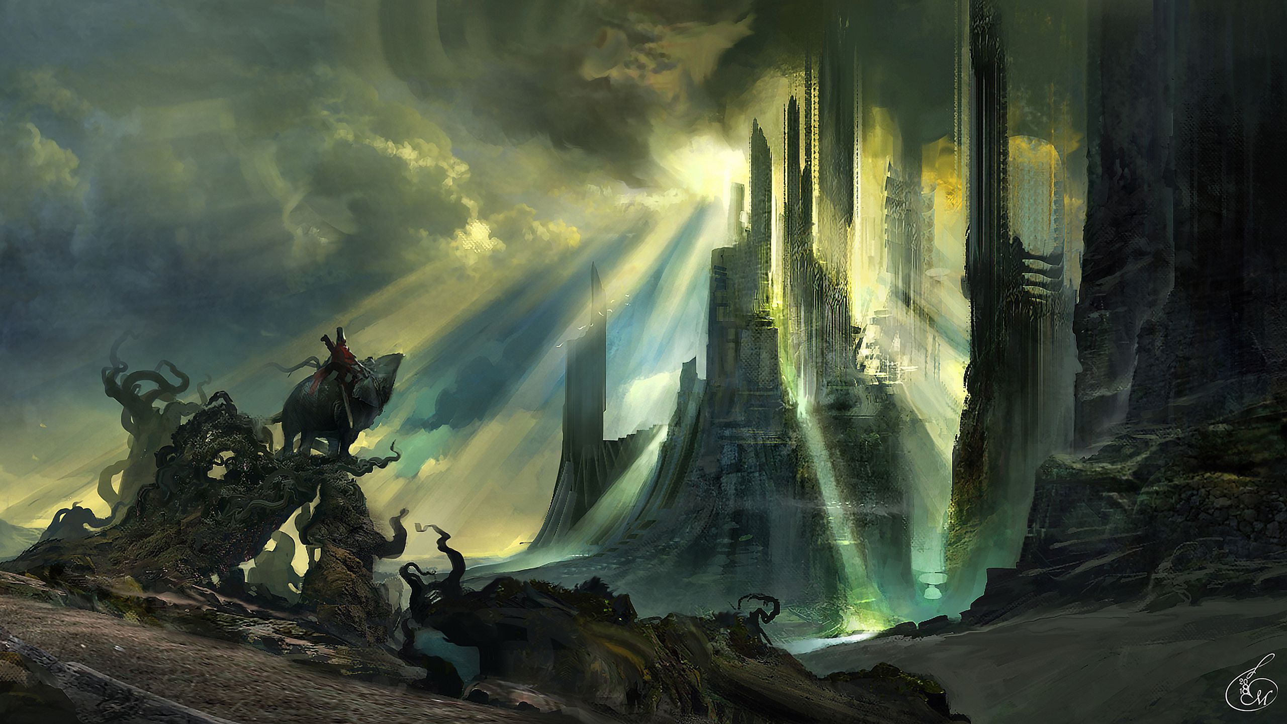 Download 2560x1440 castle, ruins, light, glow, art wallpaper, background widescreen 16:9