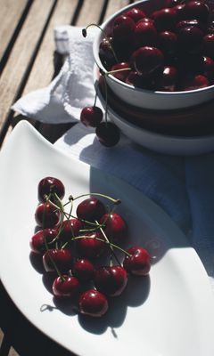 Download 240x400 cherries, cherry, berry, plate, summer wallpaper, background nokia asha 311, samsung galaxy 580, omnia, lg kp500