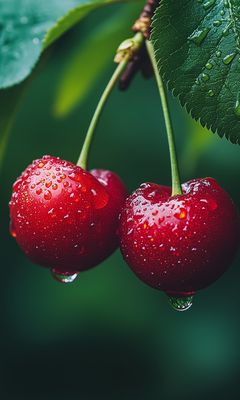 Download 240x400 cherries, fruits, drops, dew, macro, red wallpaper, background nokia asha 311, samsung galaxy 580, omnia, lg kp500