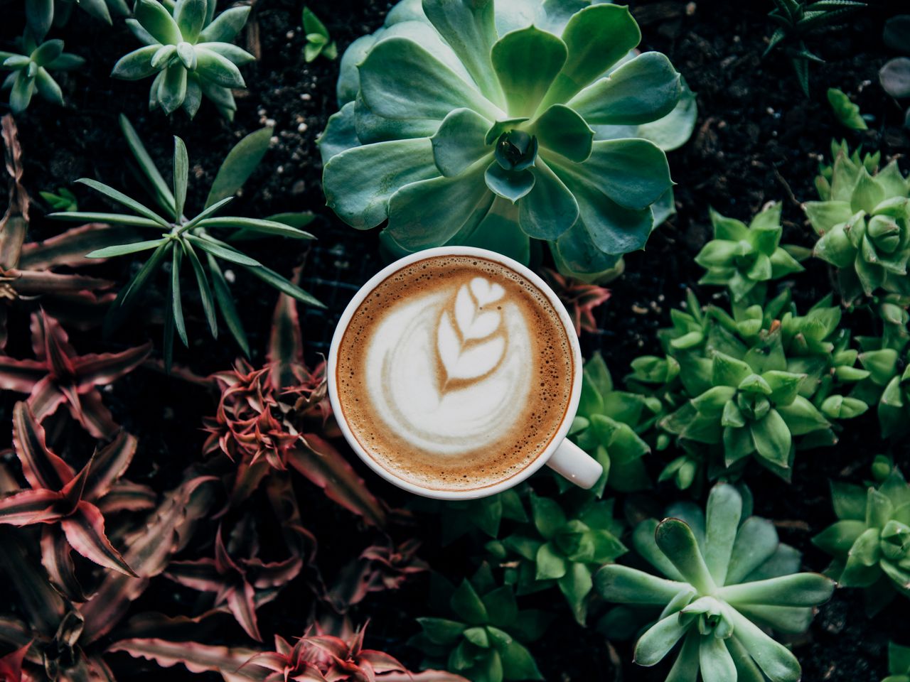 Download 1280x960 coffee, cappuccino, cup, drink, foam, plants, aerial view wallpaper, background standard 4:3