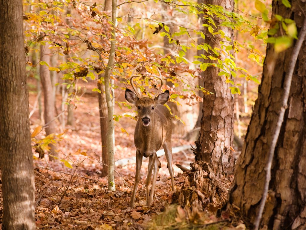Download 1024x768 deer, trees, leaves, autumn wallpaper, background standard 4:3