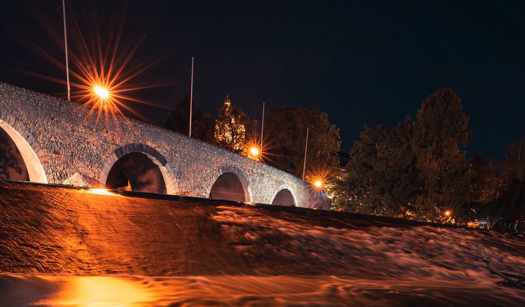 Download 1024x600 driftwood, bridge, night, lights, glow wallpaper, background netbook, tablet