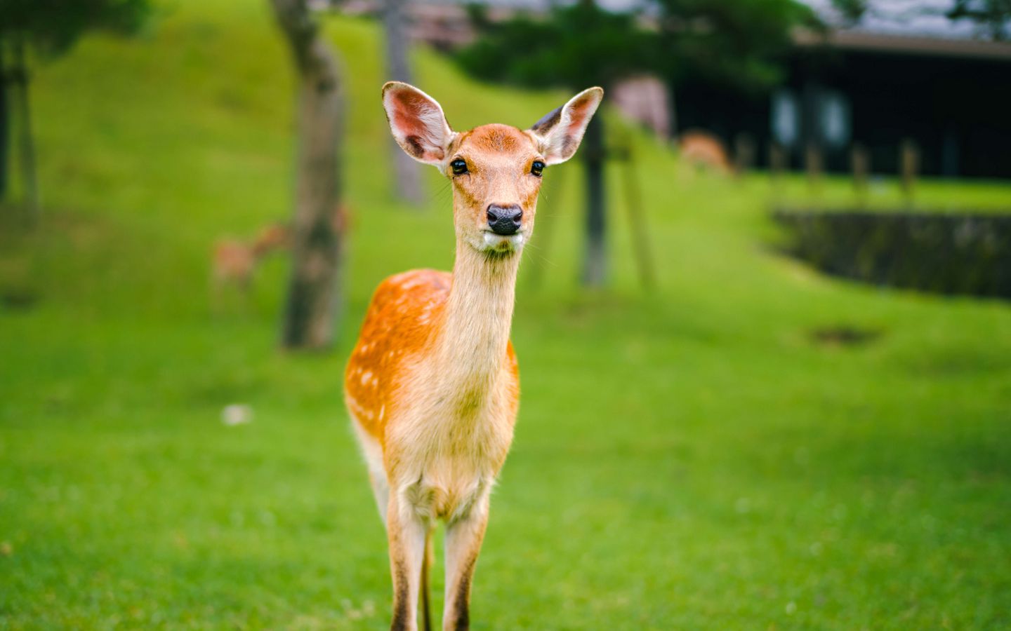 Download 1440x900 fawn, baby, lawn, grass, wildlife wallpaper, background widescreen 16:10
