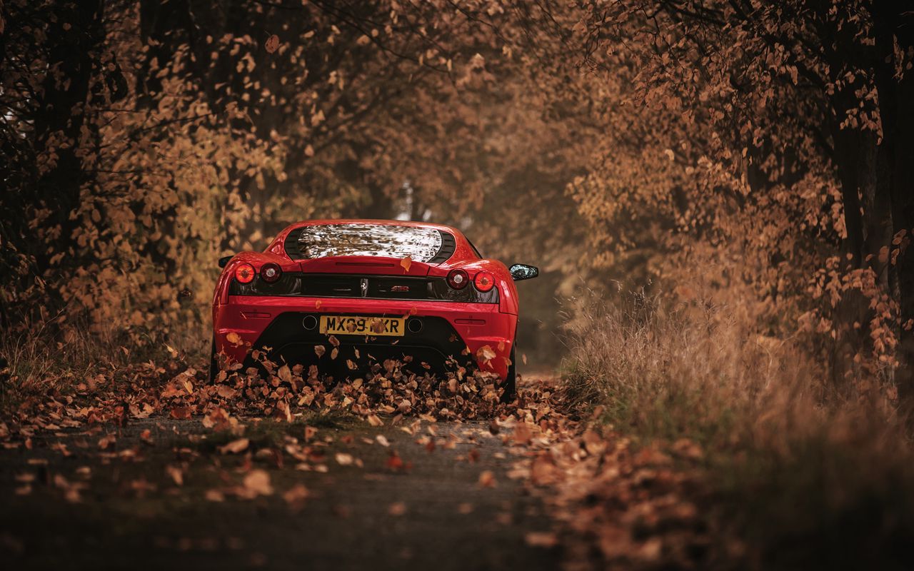 Download 1280x800 ferrari, scuderia, racing, red, rear view, autumn wallpaper, background widescreen 16:10