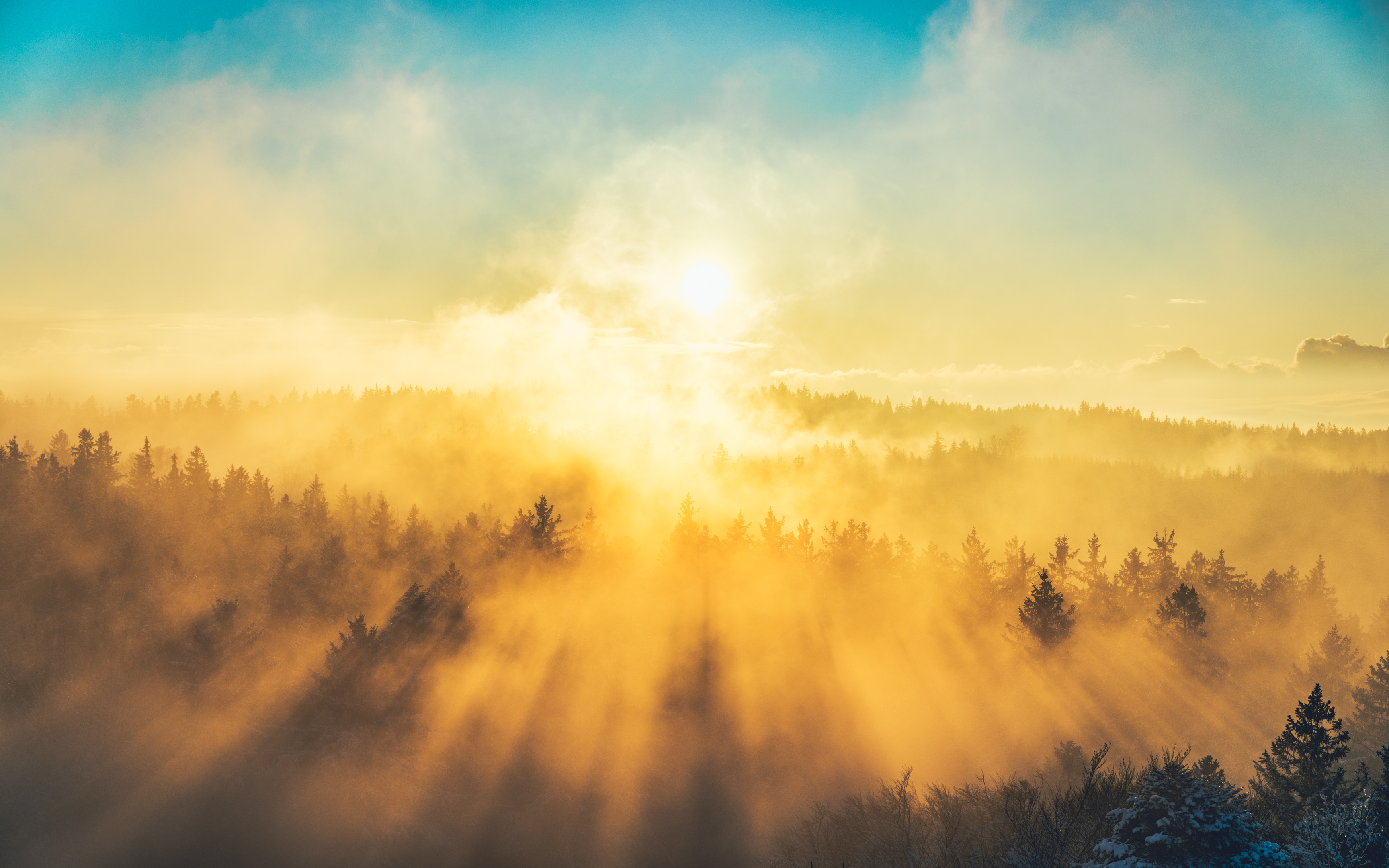 Download 3456x2160 fog, trees, light, sun, nature wallpaper, background