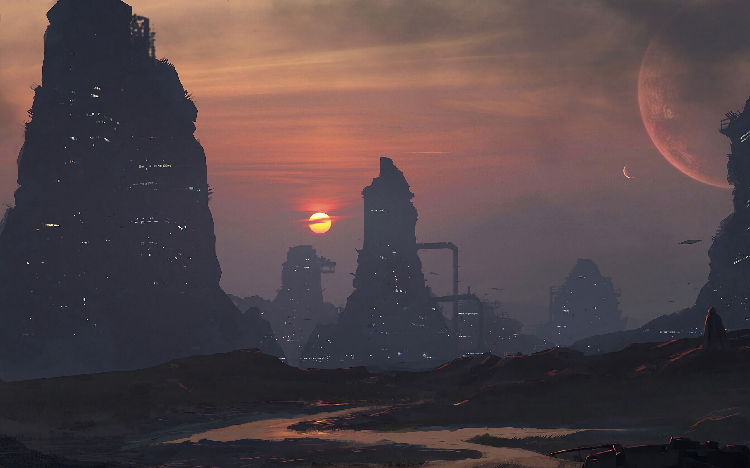 Download 2560x1600 futurism, fantasy, city, sunset, art wallpaper, background widescreen 16:10