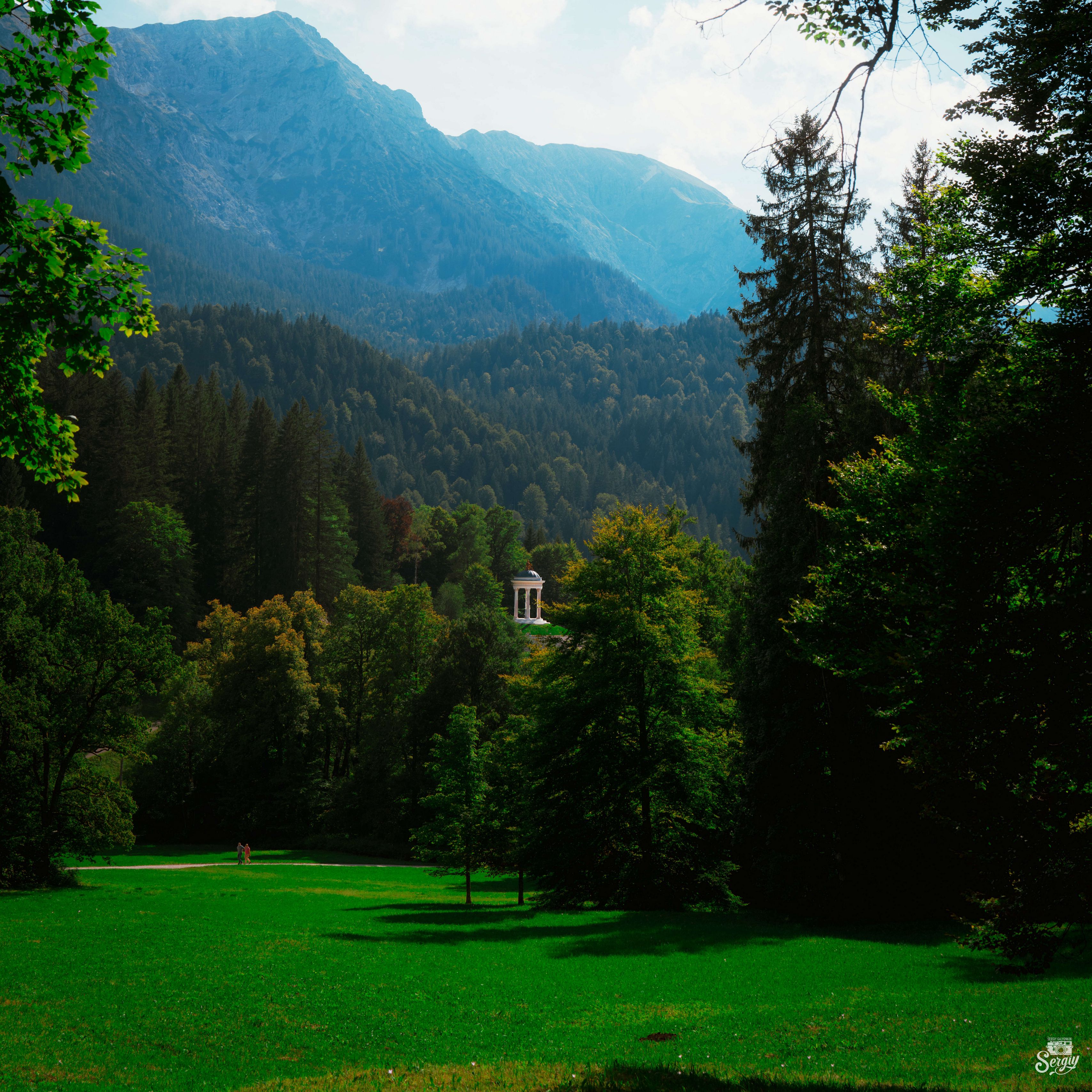 Download 3415x3415 gazebo, trees, grass, sky, mountains, landscape, germany wallpaper, background ipad pro 12.9" retina for parallax