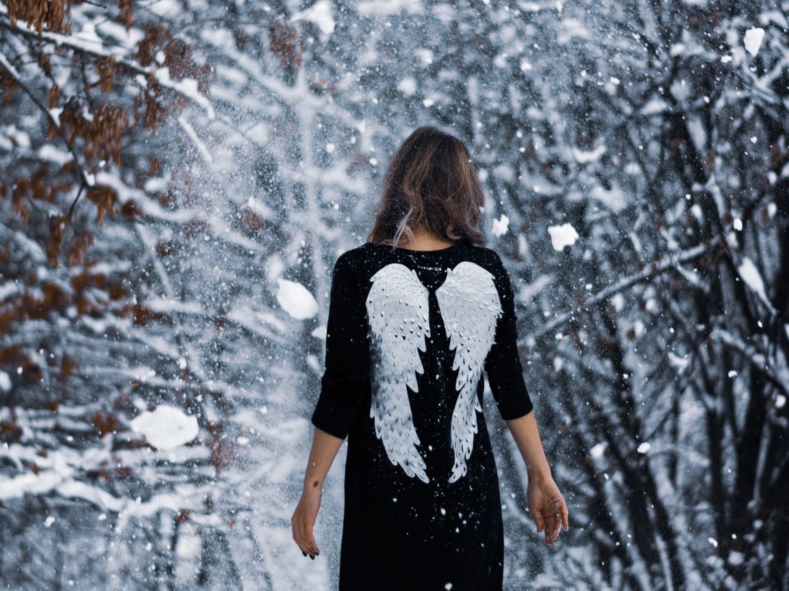 Download 1152x864 girl, angel, wings, sad, forest, winter wallpaper, background standard 4:3