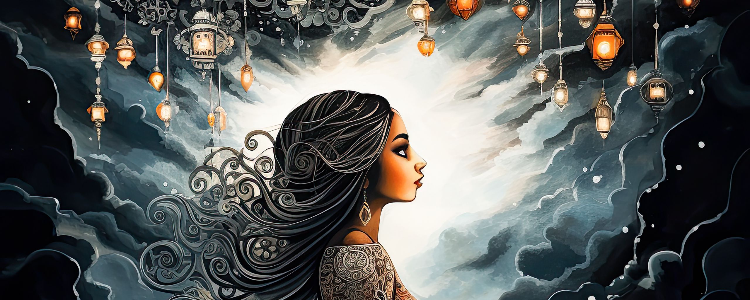 Download 2560x1024 girl, jewelry, lamps, clouds, waves, art wallpaper, background ultrawide monitor