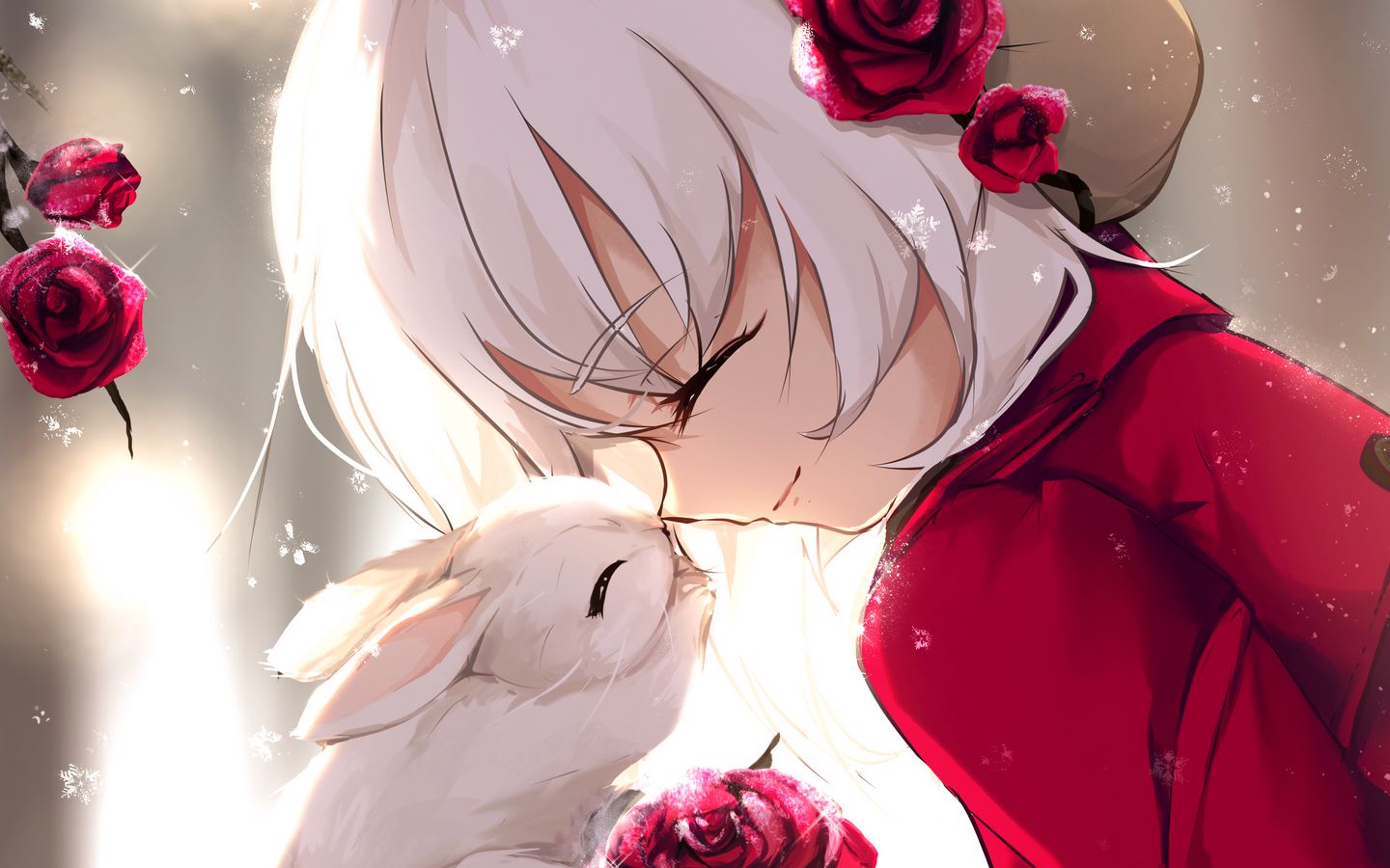 Download 1440x900 girl, rabbit, happiness, smile, roses, anime wallpaper, background widescreen 16:10