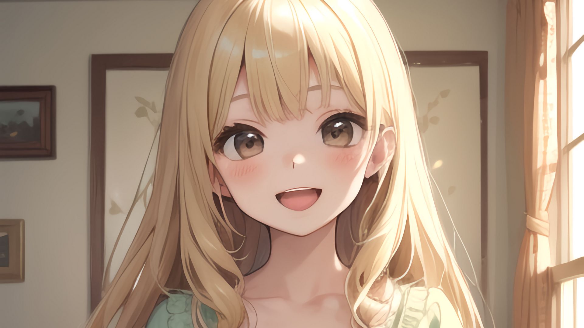 Download 1920x1080 girl, smile, blonde, window, anime wallpaper, background full hd, hdtv, fhd, 1080p