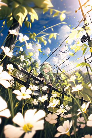 Download 320x480 girl, smile, flowers, field, hedge, summer, anime wallpaper, background samsung galaxy ace gt-s5830, sony xperia e, miro, htc wildfire s, c, lg optimus