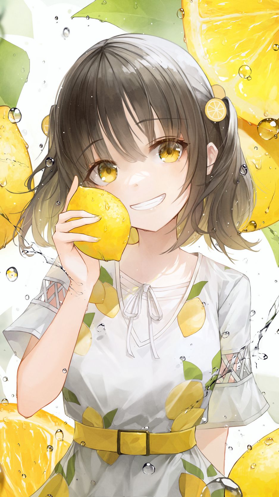 Download 938x1668 girl, smile, lemons, lemonade, drops, yellow, anime wallpaper, background iphone 8/7/6s/6 for parallax