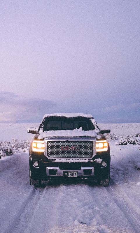 Download 480x800 gmc sierra, gmc, pickup, suv, black, front view, snow, winter, offroad wallpaper, background nokia x, x2, xl, 520, 620, 820, samsung galaxy star, ace, asus zenfone 4