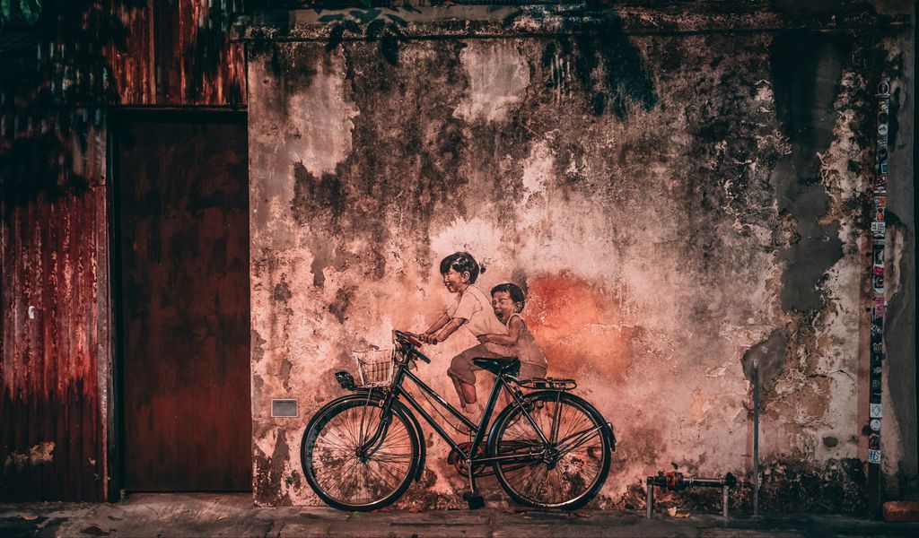 Download 1024x600 graffiti, bicycle, children, wall, old wallpaper, background netbook, tablet