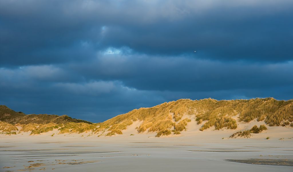 Download 1024x600 hills, beach, clouds, sky, dark, landscape wallpaper, background netbook, tablet