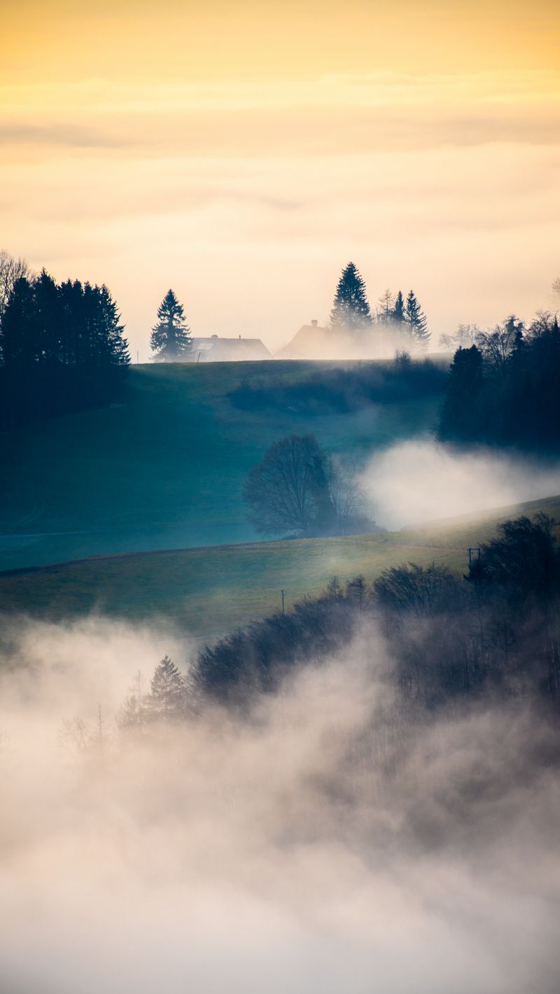 Download 800x1420 hills, trees, fog, clouds, landscape wallpaper, background iphone se/5s/5c/5 for parallax