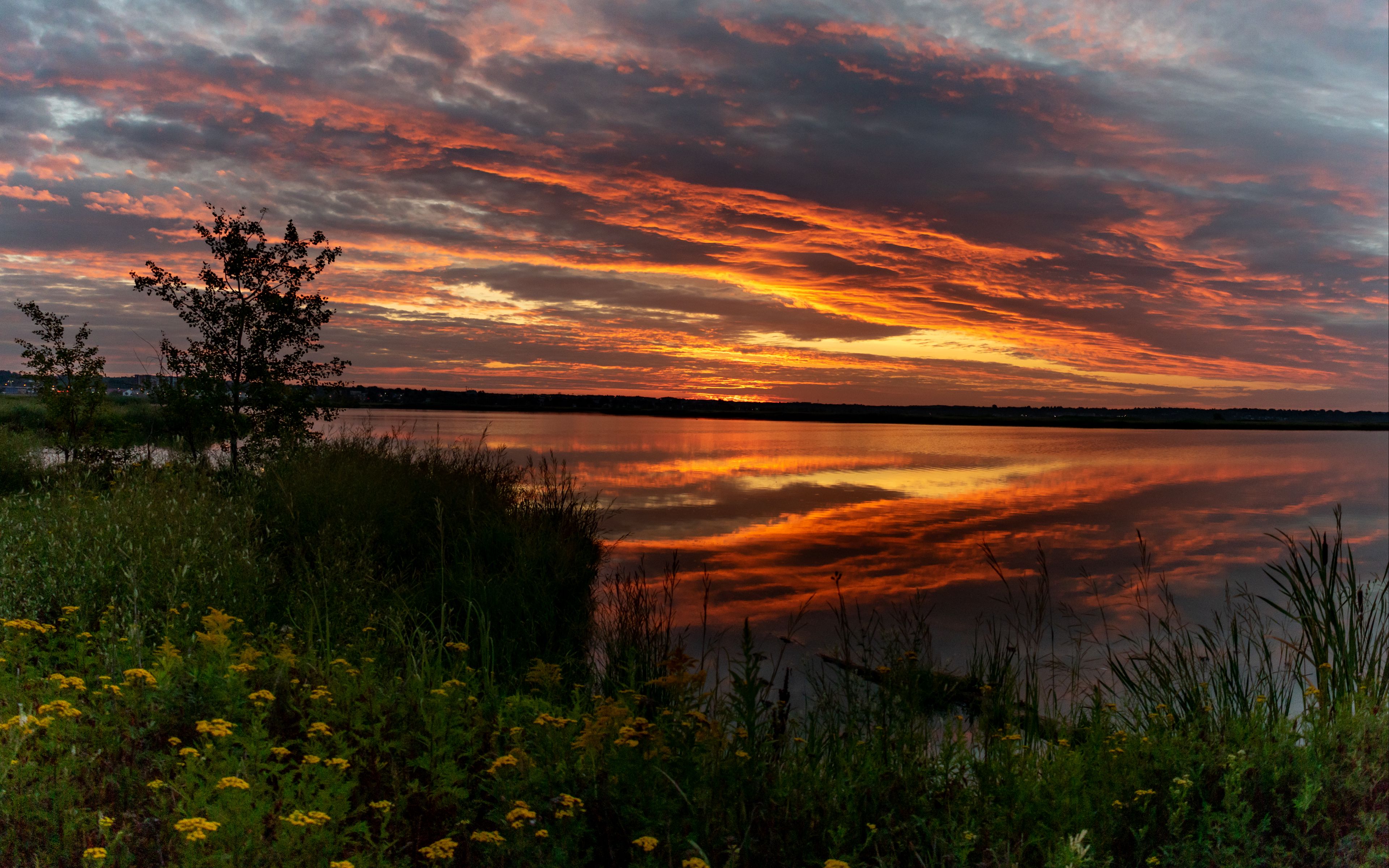 Download 3840x2400 horizon, sunset, bushes, water wallpaper, background 4k ultra hd 16:10