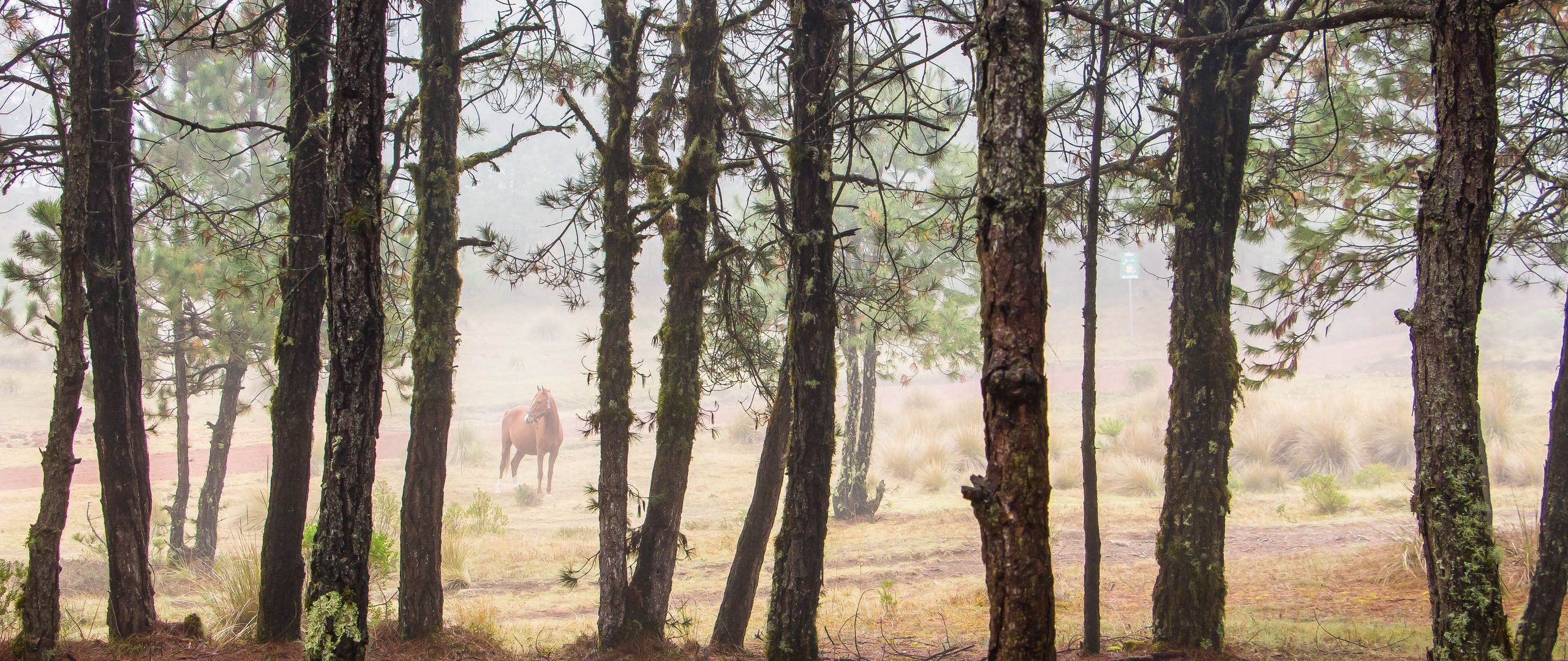 Download 2560x1080 horse, forest, trees, animal wallpaper, background dual wide 1080p