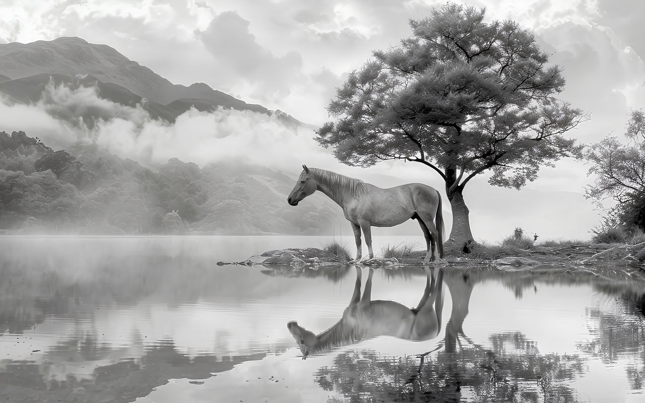 Download 1280x800 horse, tree, reflection, pond, bw wallpaper, background widescreen 16:10