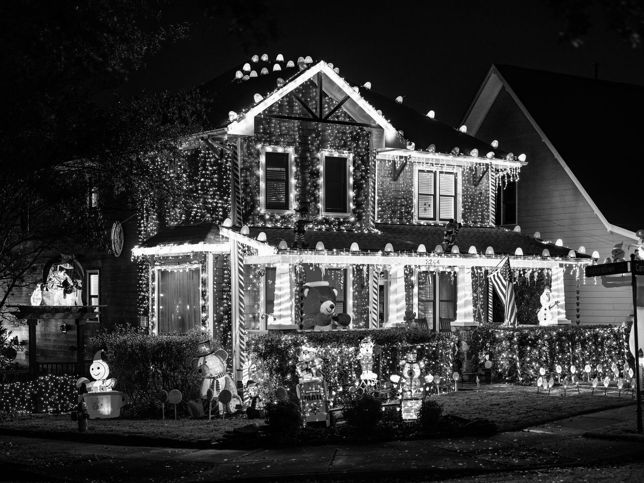 Download 1280x960 house, lights, garlands, decorations, black and white, new year, christmas wallpaper, background standard 4:3