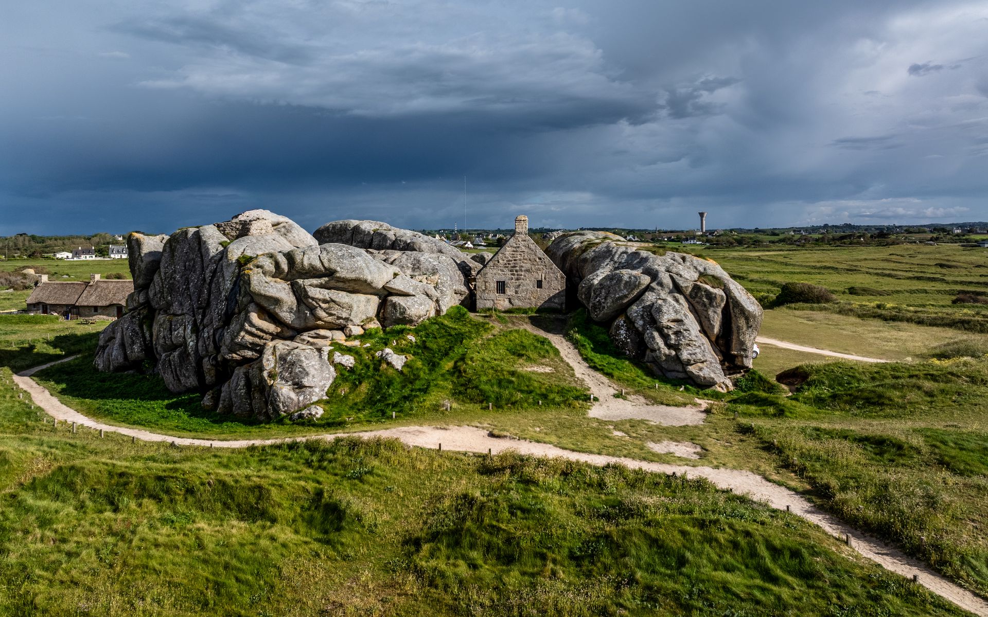 Download 1920x1200 house, stones, path, grass, sky wallpaper, background widescreen 16:10