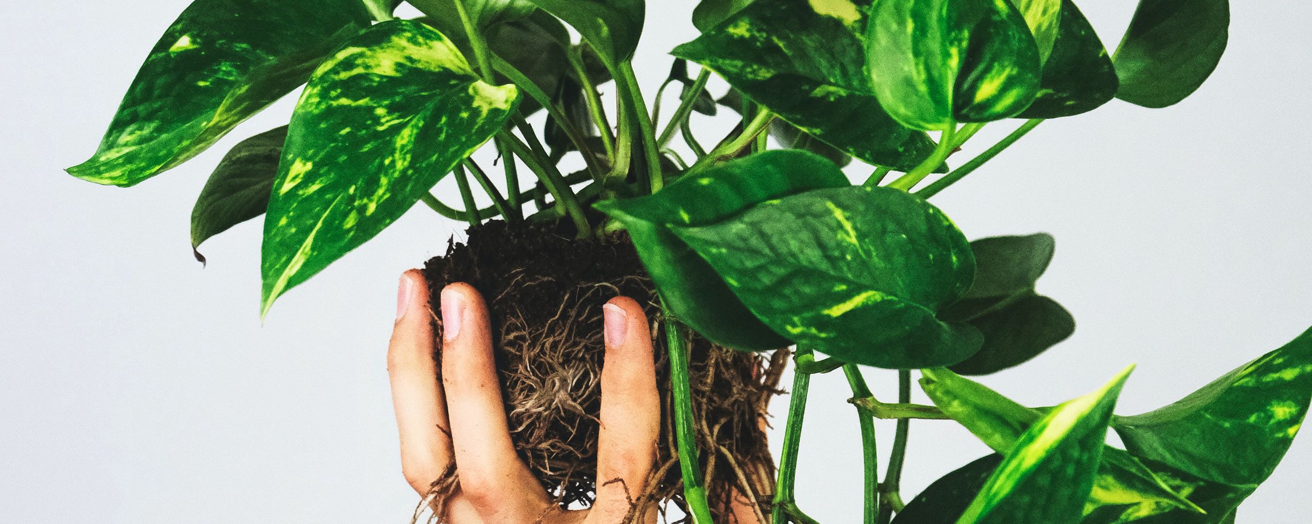 Download 2560x1024 houseplant, leaves, hand, white wallpaper, background ultrawide monitor