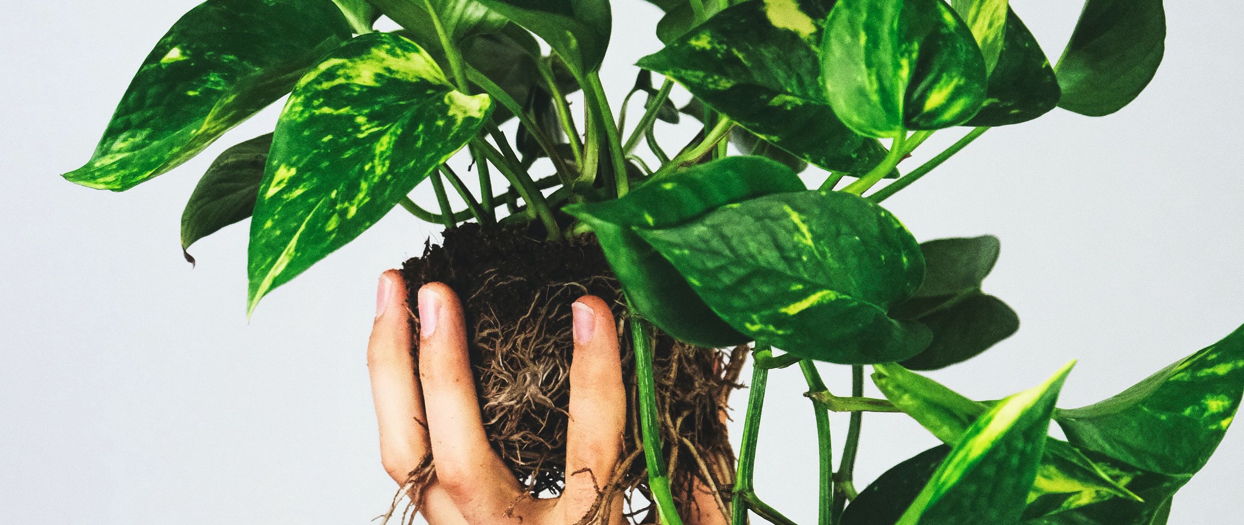 Download 2560x1080 houseplant, leaves, hand, white wallpaper, background dual wide 1080p