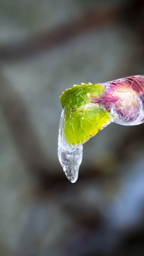 Download 480x854 icicle, ice, leaves, blur, macro wallpaper, background nokia lumia 630, sony ericsson xperia