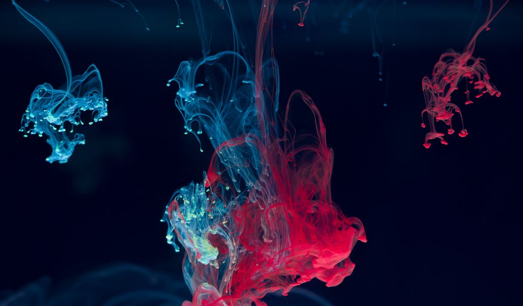 Download 1024x600 ink, water, blending, paint, drops, red, blue wallpaper, background netbook, tablet