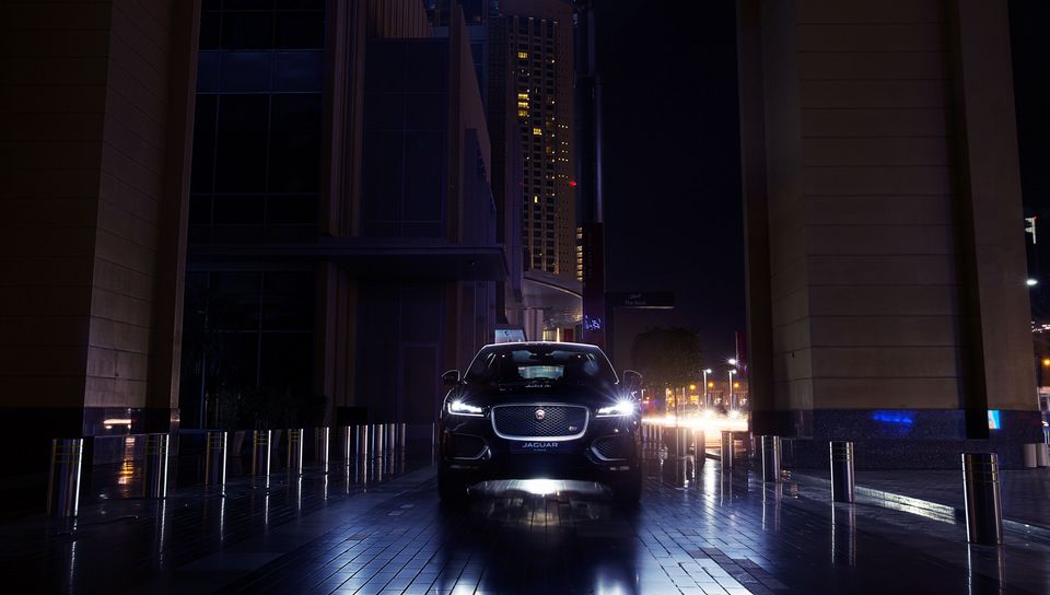 Download 960x544 jaguar f-pace, jaguar, suv, lights, night city, light wallpaper, background playstation ps vita