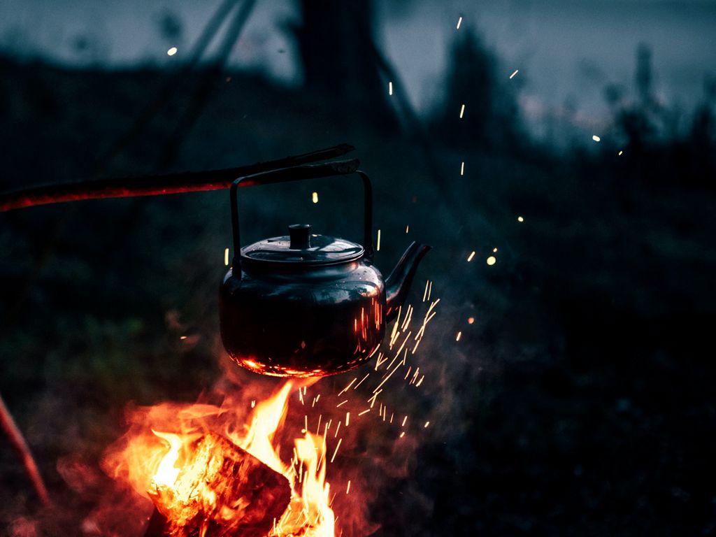 Download 1024x768 kettle, campfire, hiking, tourism, night wallpaper, background standard 4:3